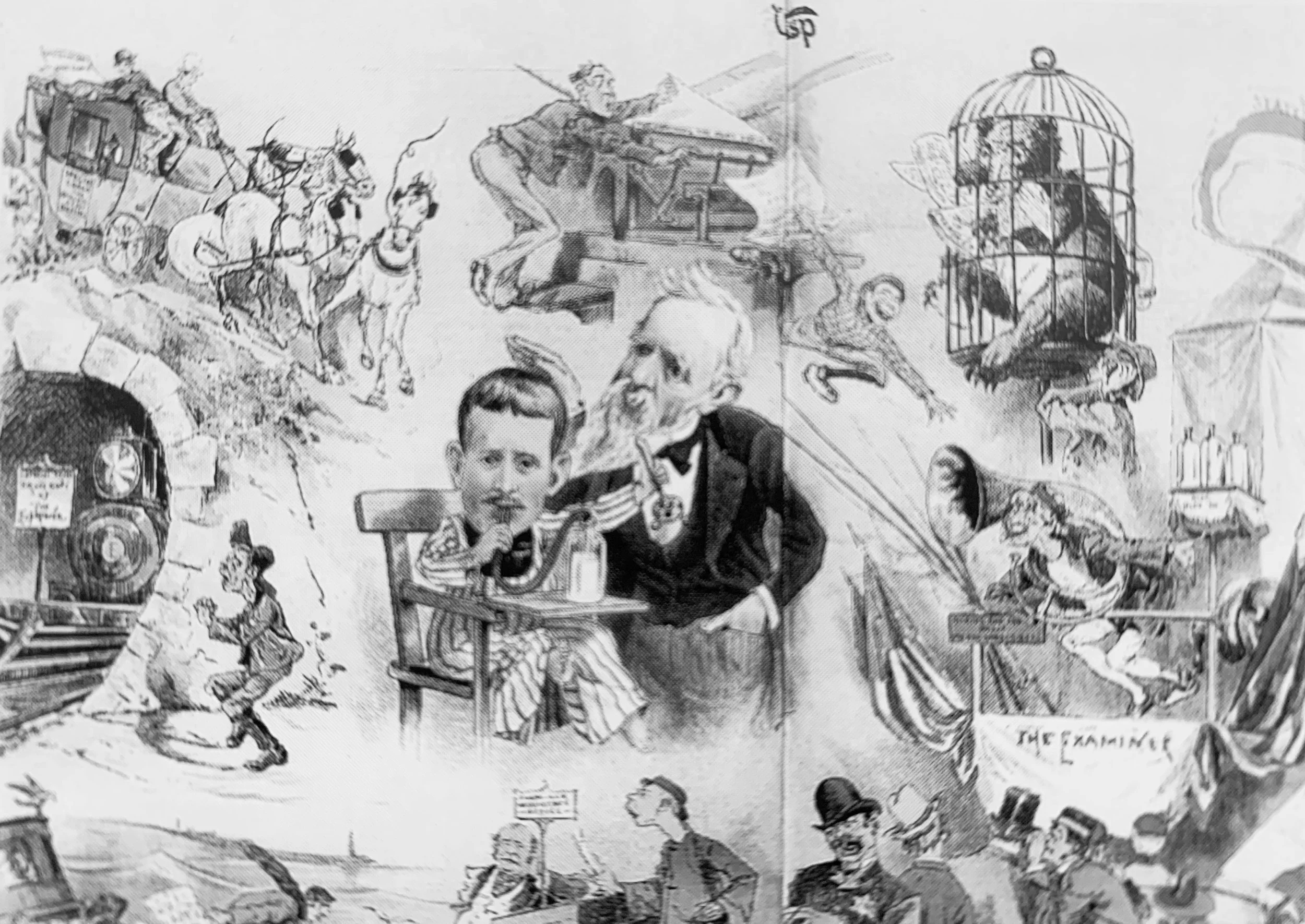 “Juvenile Journalism.” Young “Willie” Hearst as a spoiled toddler backed by the mining millions of his indulgent father is surrounded by the expensive journalistic stunts that enabled the Examiner to surpass the circulation of Michael de Young’s Chronicle. The Wasp, February 15, 1890. Courtesy Bancroft Library.